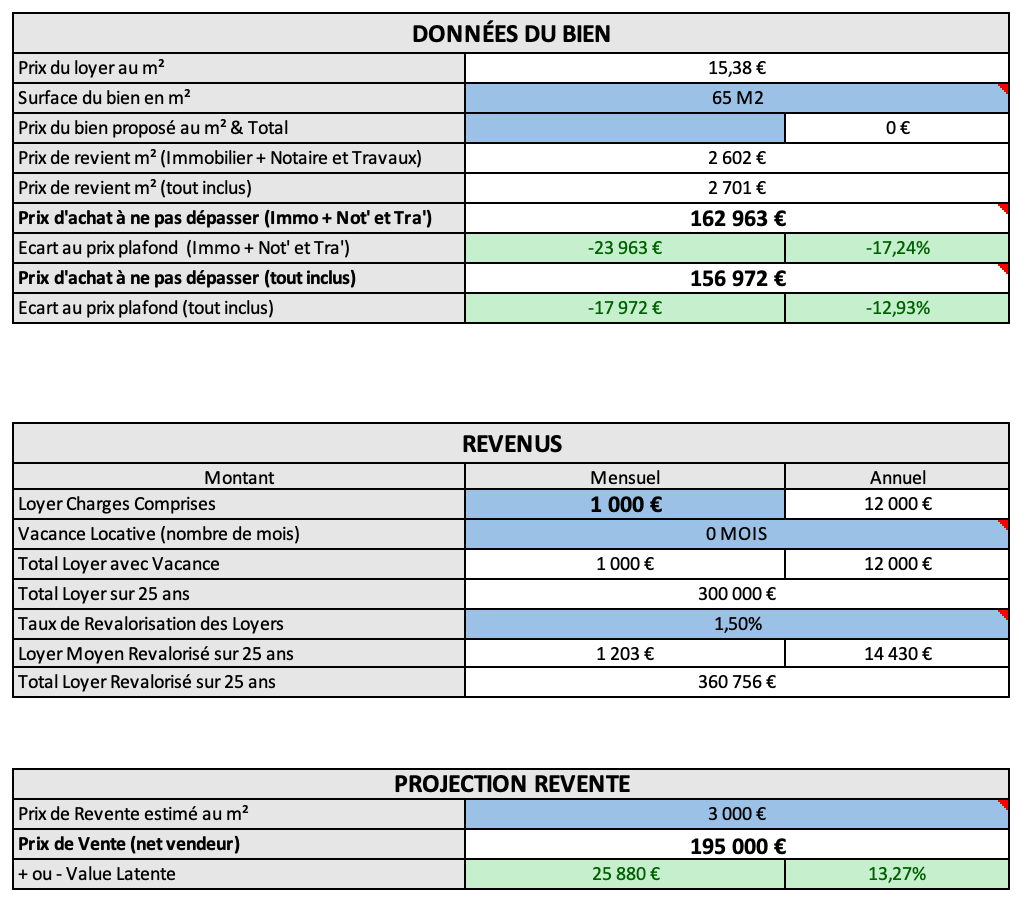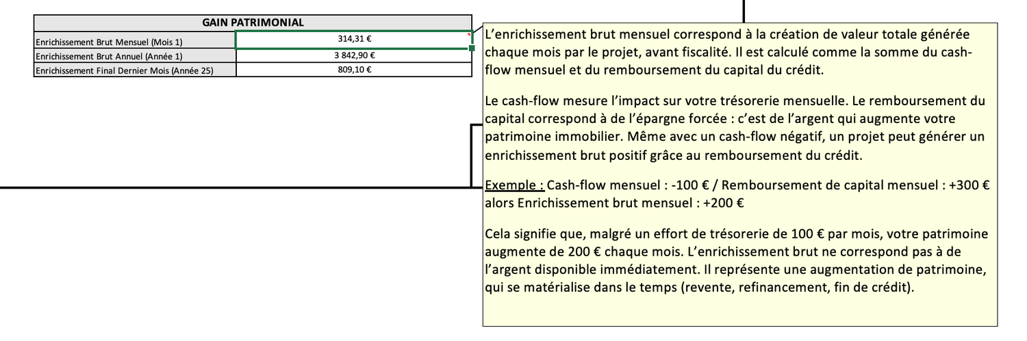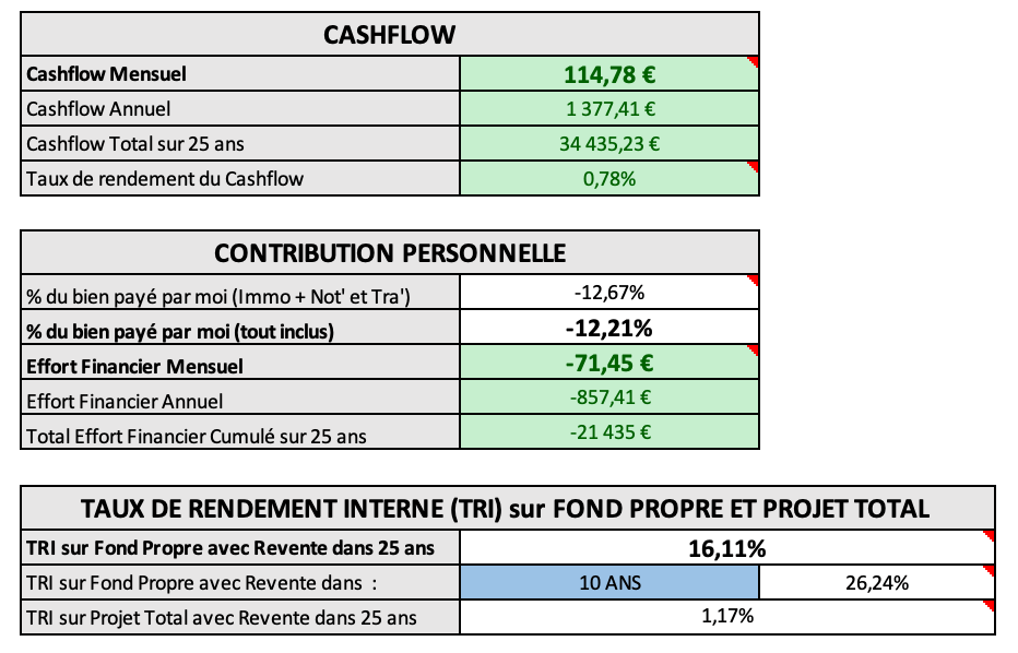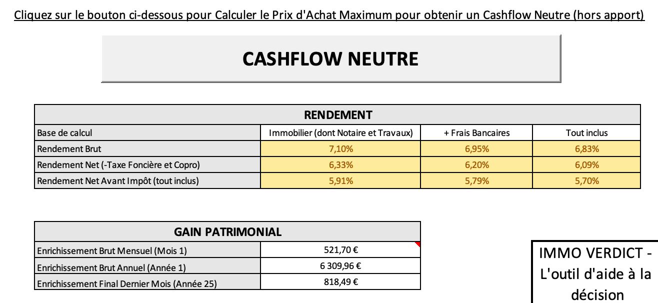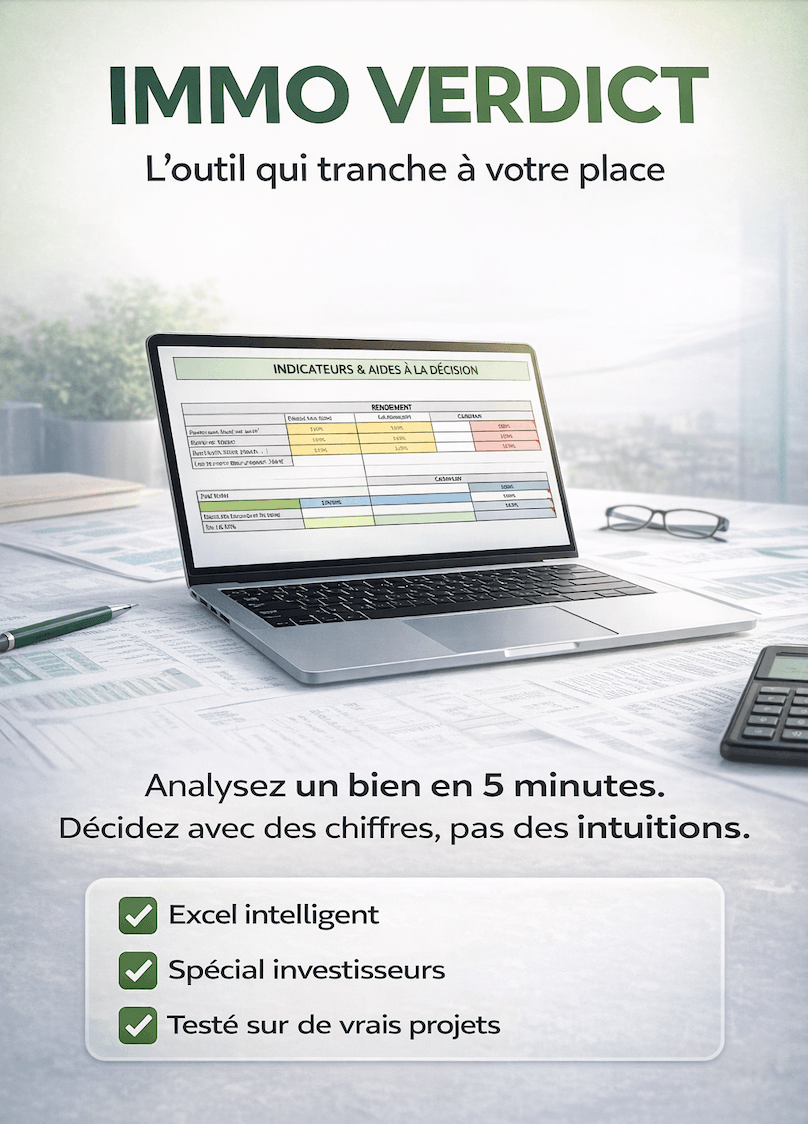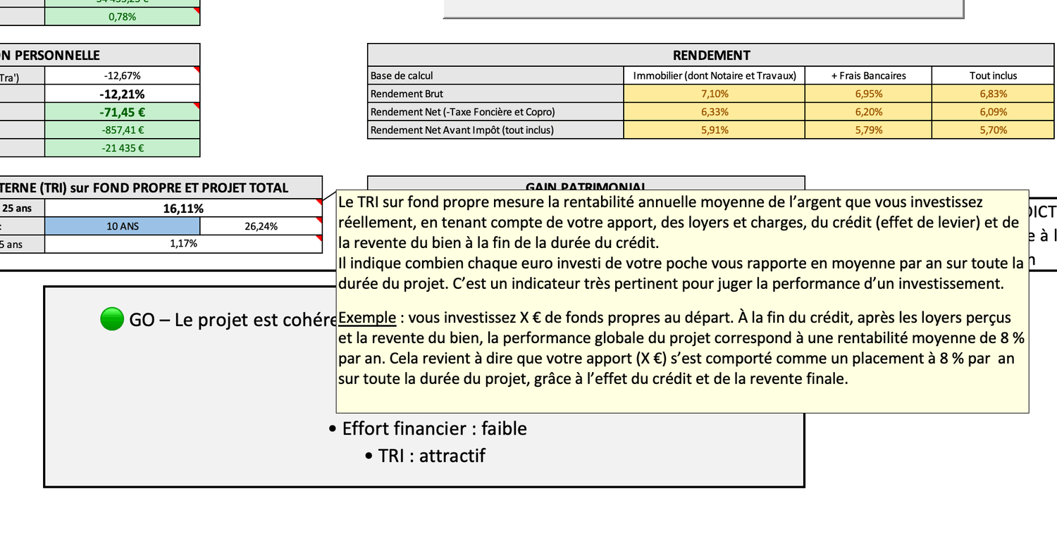 Cashflow mensuel, effort financier, rendement net, TRI, prix cible… Chaque métrique est calculée et interprétée pour vous.