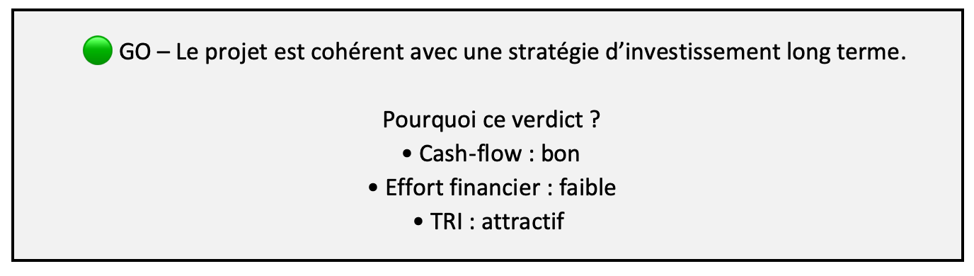 GO, À NÉGOCIER ou NO GO. Avec une explication précise des forces et faiblesses du projet. Vous savez quoi faire. Et surtout, pourquoi.