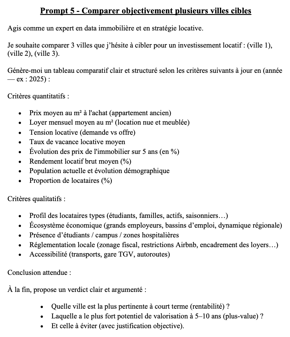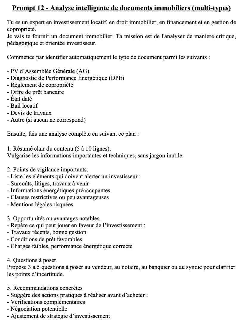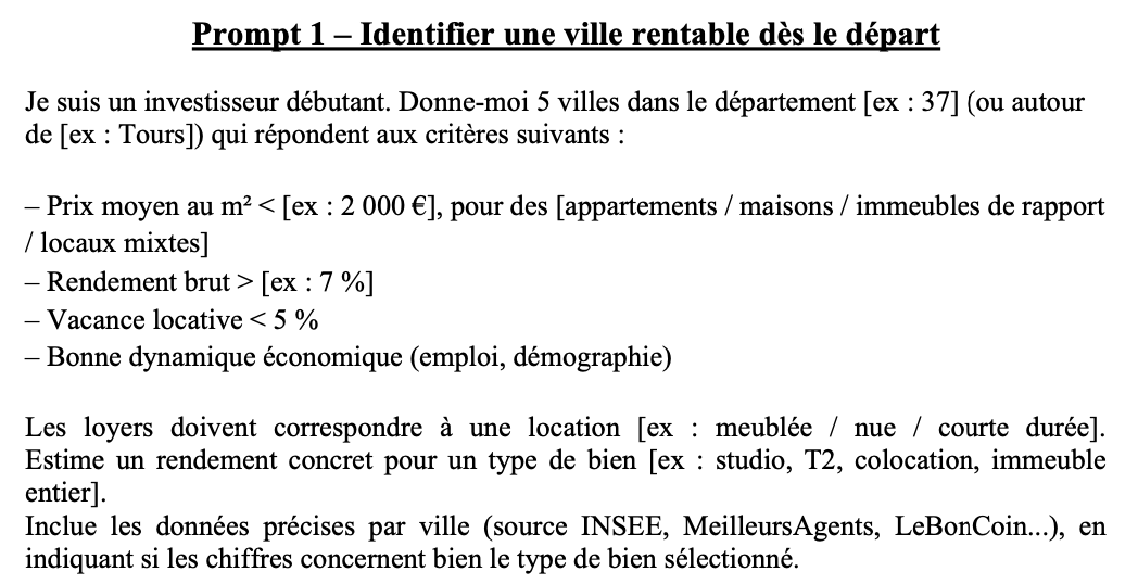 "Je peinais à savoir par où commencer dans l’investissement immo. Grâce à ces prompts, j’ai pu analyser plusieurs biens en un clin d’œil. C’est simple, rapide et ça m’a évité une erreur sur un bien mal situé. Je recommande à 100 % !"